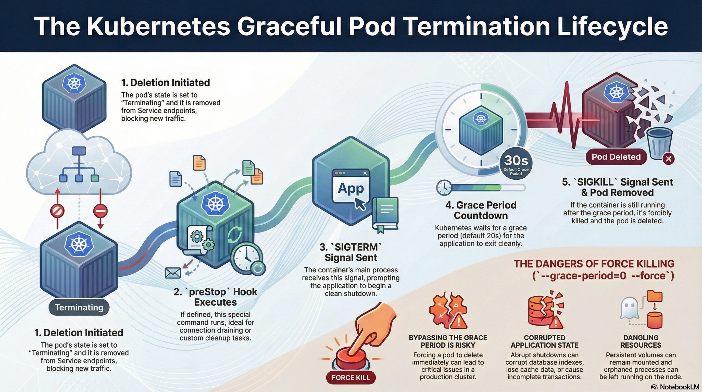 iptablesor the Cloud Load Balancer. During that gap, traffic is still sent to the dying pod, which is rejecting connections. Users see 502 errors.